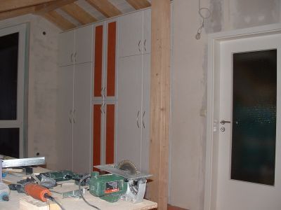 Noch wohnlicher wird es natürlich durch Möbel. Hier unser Kleiderschrank und Raumteiler.